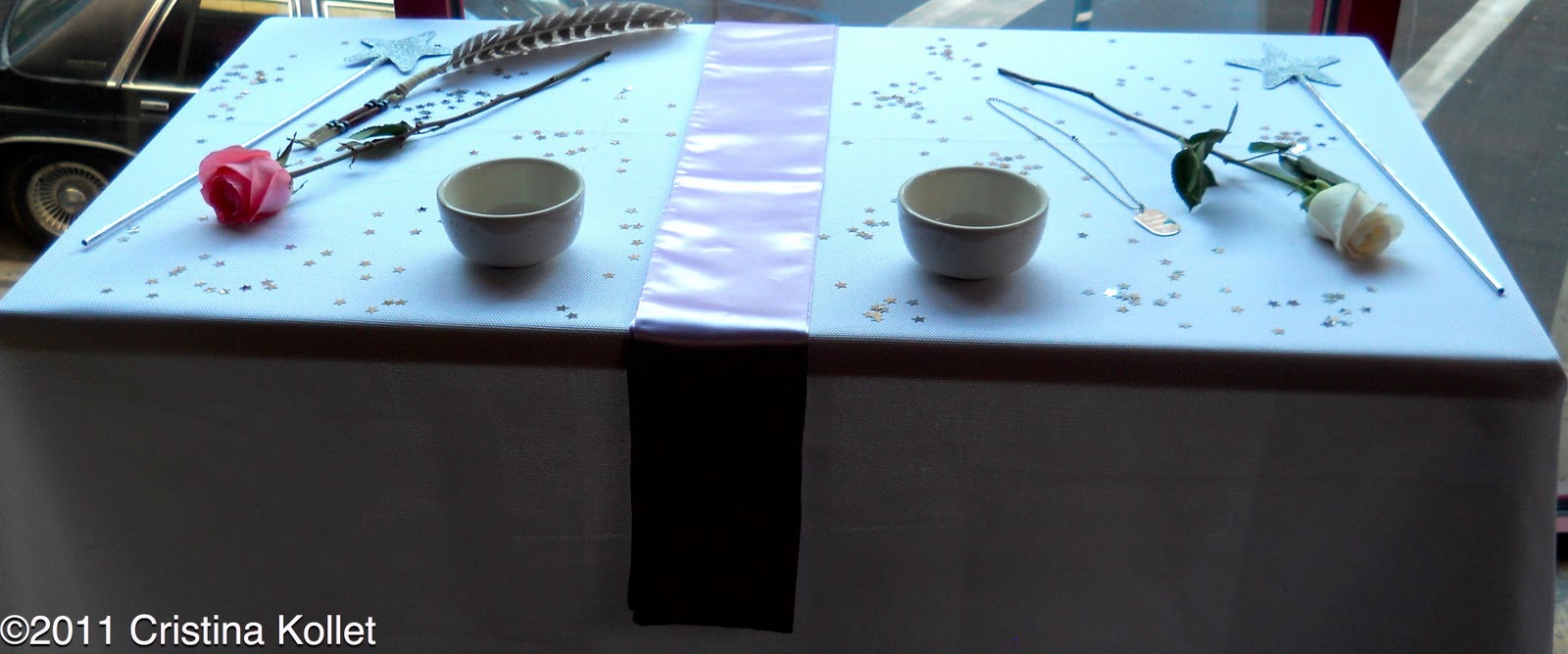 Oil, water, roses, and a feather for blessing, the handfasting sash and gifts for Justin and Grace |